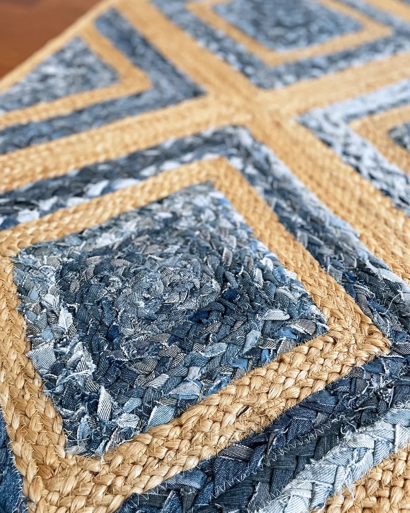 Esta alfombra trenzada a mano combina yute natural y denim reciclado. Con sus patrones étnicos en tonos azules le da a cualquier decoración un aire original y acogedor.